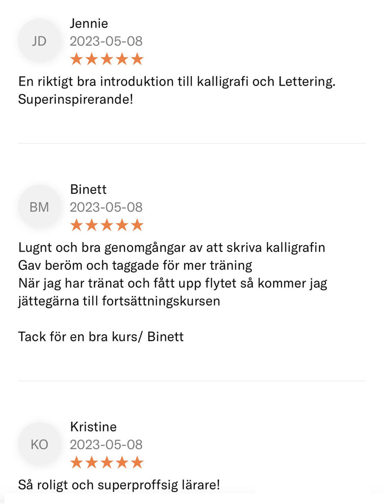 Allt material finns på plats och ni kommer får ta med er häften och pennor som ni kan öva med hemma efter kursen. Det är så här jag började min resa inom modern kalligrafi och lettering och jag hoppas kunna inspirera även dig till att börja skriva!