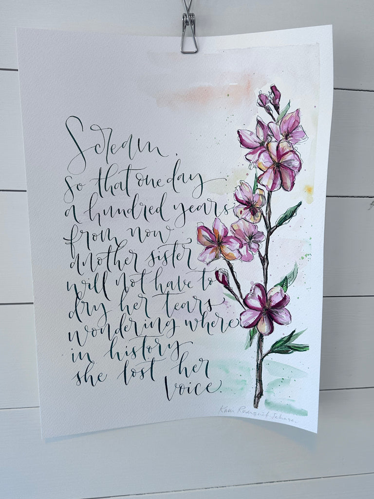 Screamso that one day, a hundred years from now another sister will not have to dry her tears, wondering where in history she lost her voice. *Poem by Jasmin Kaur*Original art, watercolor and ink. Size: A3, comes unframed.