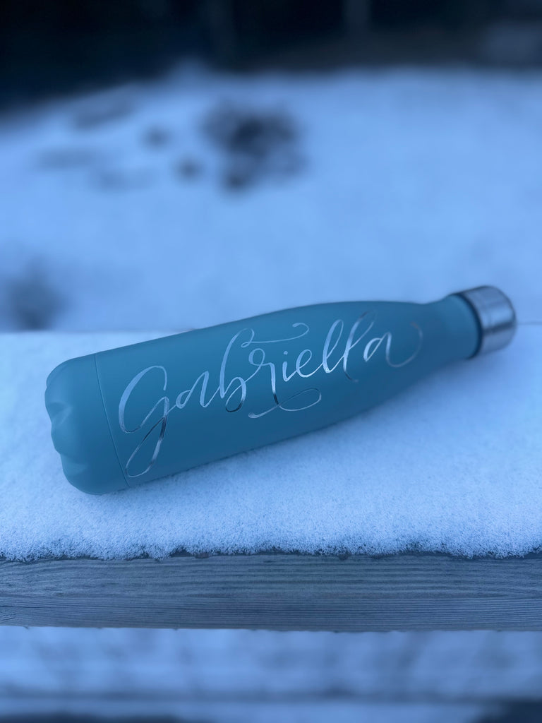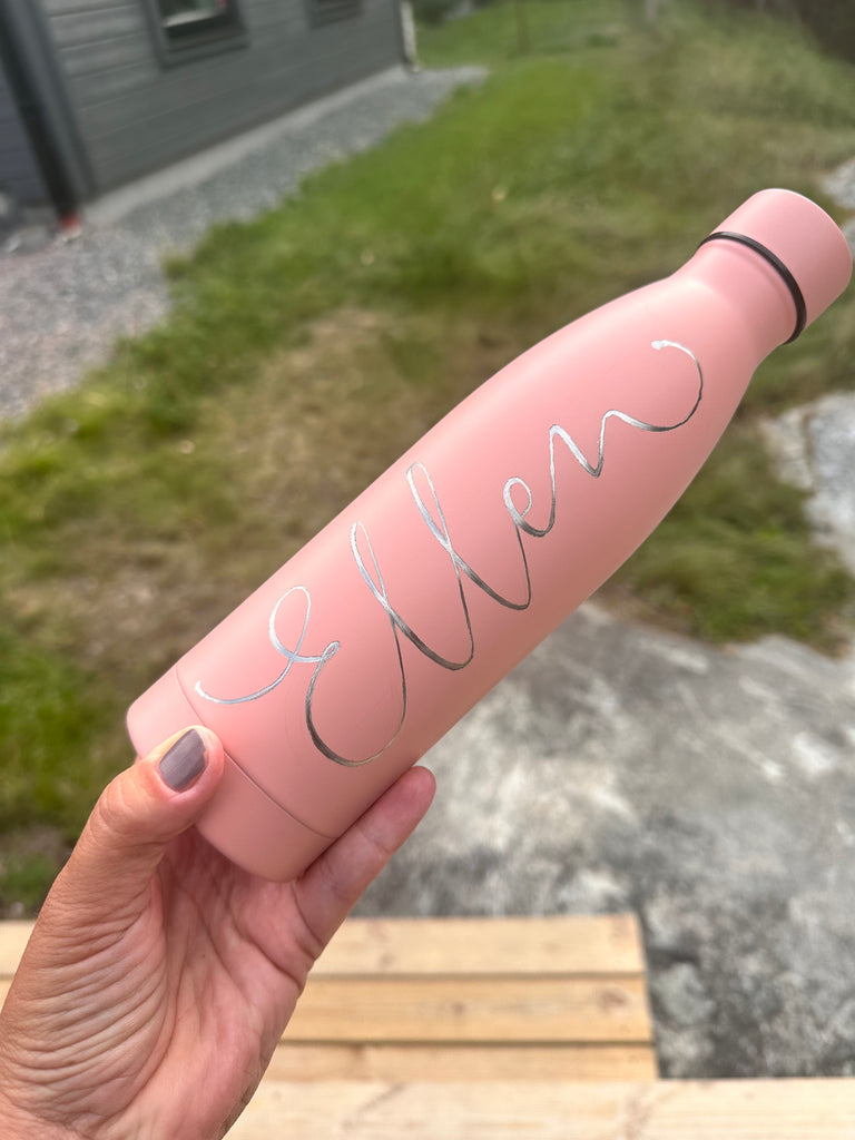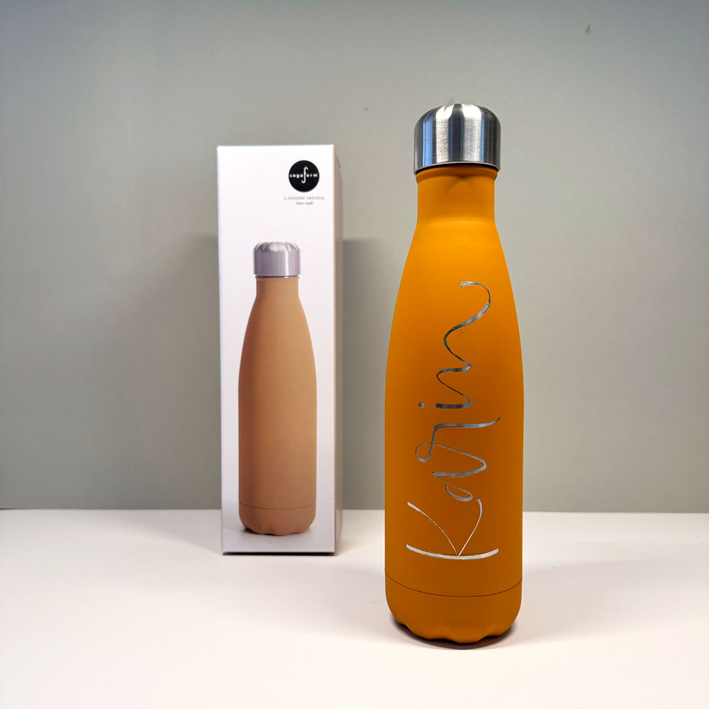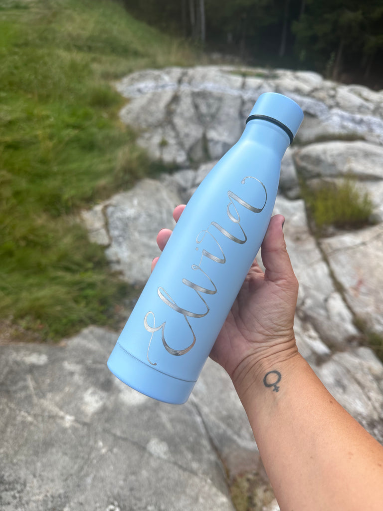 Vattenflaska i rostfritt stål med ingraverat valfritt namn eller ord.