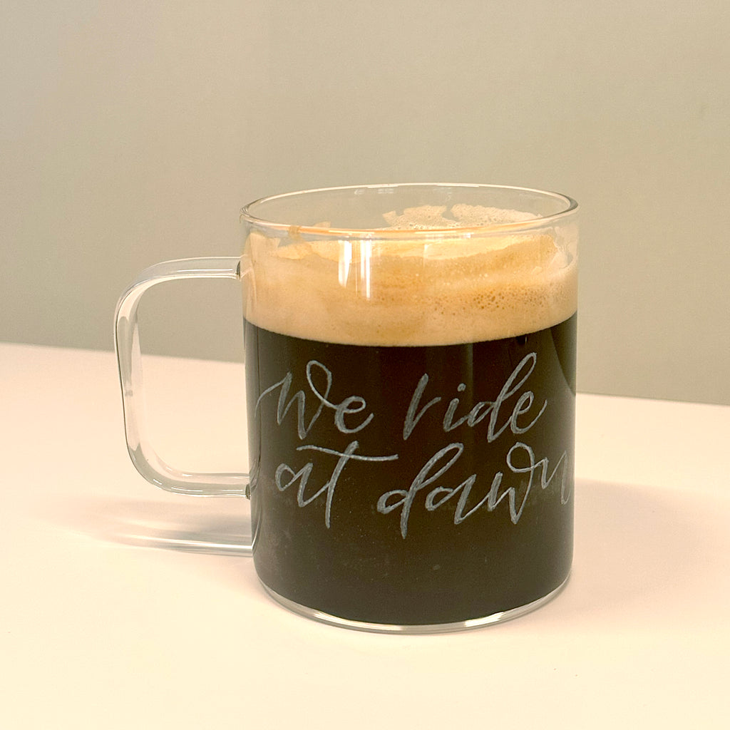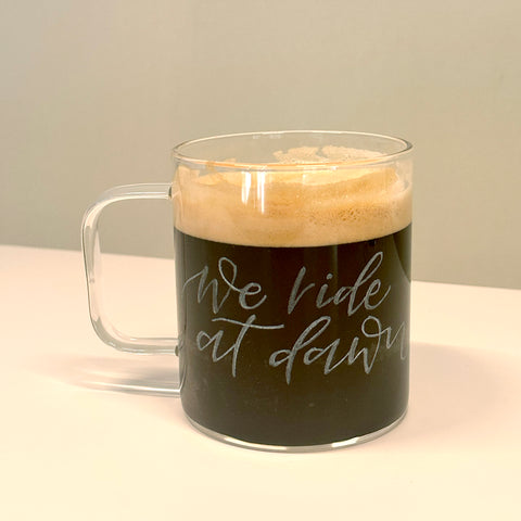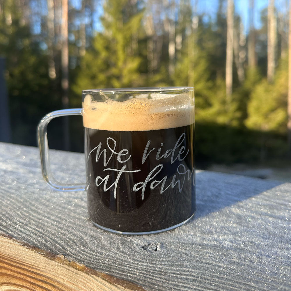 *We ride at dawn* Muggar av glas, graverade för hand.Endast ett fåtal finns. **Egen text på muggar?** Kontakta mig för att få din egen valda text graverad på muggarna.